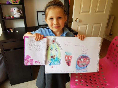 Charley really enjoyed her English activity today. She drew different types of fruit and vegetables, gave them names and wrote sentences for each of the characters.
